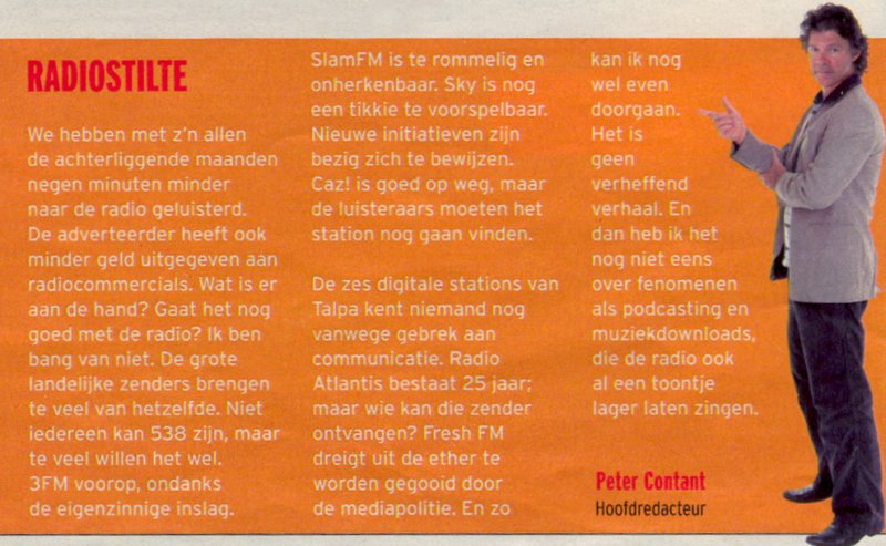 Den Bosch - 11 november 2006 - We hebben met z'n allen de achterliggende maanden negen minuten minder naar de radio geluisterd. De adverteerder heeft ook minder geld uitgegeven aan radiocommercials. Wat is er aan de hand?