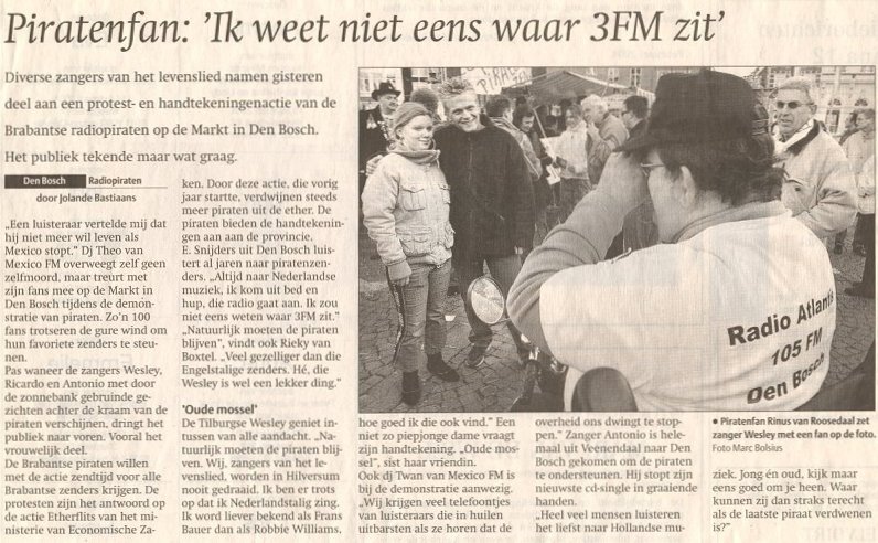 Den Bosch - 23 februari 2004 - Diverse zangers van het levenslied namen gisteren deel aan een protest- en handtekeningenactie van de Brabantse radiopiraten op de Markt in Den Bosch. Het publiek tekende maar wat graag. 'Een luisteraar vertelde mij dat hij niet meer wil leven als Mexico stopt.'