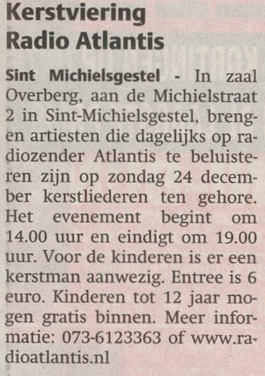 Sint Michielsgestel - 17 december 2006 - In zaal Overberg, aan de Michielstraat 2 in Sint-Michielsgestel, brengen artiesten die dagelijks op radiozender Atlantis te beluisteren zijn op zondag 24 december kerstliederen ten gehore. Het evenement begint om 14.00 uur en eindigt om 19.00 uur.