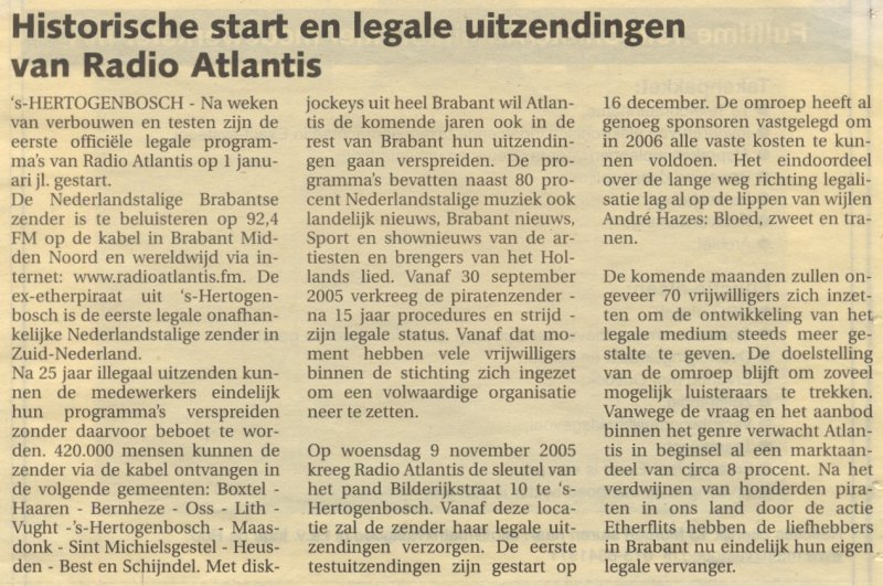 Den Bosch - 10 maart 2006 - Na weken van verbouwen en testen zijn de eerste officiële legale programma's van Radio Atlantis op 1 januari jl. gestart. De Nederlandstalige Brabantse zender is te beluisteren op 92,4 FM op de kabel in Brabant Midden Noord en wereldwijd via internet: www.radioatlantis.fm.