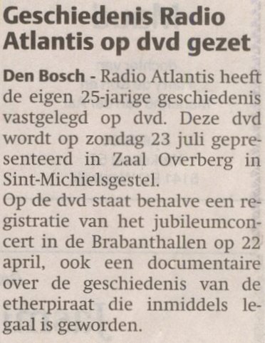 Den Bosch - 8 juli 2006 - Radio Atlantis heeft de eigen 25-jarige geschiedenis vastgelegd op dvd. Deze dvd wordt op zondag 23 juli gepresenteerd in Zaal Overberg in Sint-Michielsgestel. Op de dvd staat behalve een registratie van het jubileumconcert in de Brabanthallen op 22 april, ook een documentaire over de geschiedenis van de etherpiraat die inmiddels legaal is geworden.