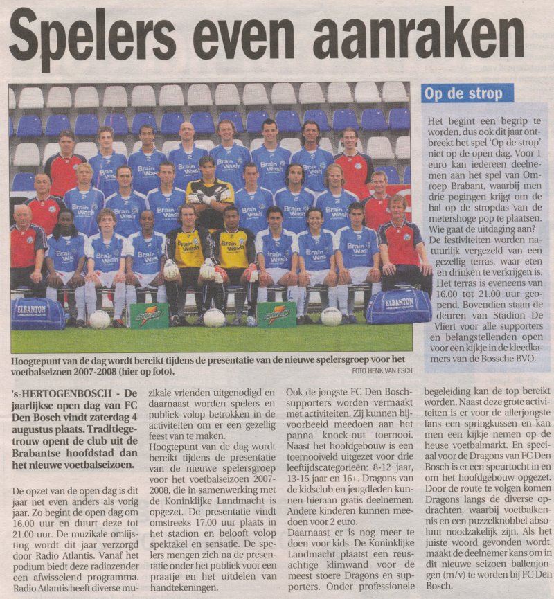 Den Bosch - 26 juli 2007 - De jaarlijkse open dag van FC Den Bosch vindt zaterdag 4 augustus plaats. Traditiegetrouw opent de club uit de Brabantse hoofdstad dan het nieuwe voetbalseizoen. De opzet van de open dag is dit jaar net even anders als vorig jaar, zo begint de open dag om 16.00 uur en duurt deze tot 21.00 uur.