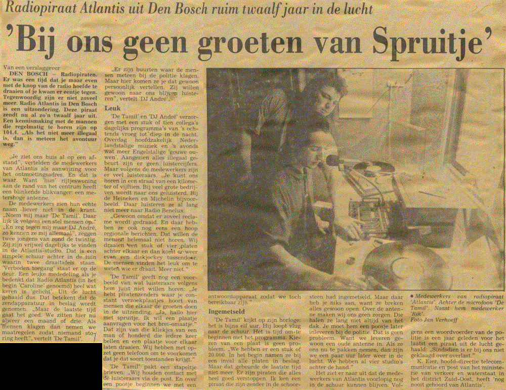 Den Bosch - 25 februari 1992 - Radiopiraten, er was een tijd dat je maar even met de knop van de radio hoefde te draaien of je kwam er eentje tegen. Tegenwoordig zijn er niet zoveel meer. Radio Atlantis in Den Bosch is een uitzondering. Deze piraat zendt nu al zo'n twaalf jaar uit. Een kennismaking met de mannen die regelmatig te horen zijn op 104.4. "Als het niet meer illegaal is, dan is meteen het avontuur weg."