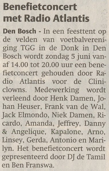 Den Bosch - 25 juli 2004 - In een feesttent op de velden van voetbalvereniging TGG in de Donk in Den Bosch wordt zondag 5 juni van 14.00 tot 20.00 uur een benefietconcert gehouden door Radio Atlantis voor de Cliniclowns.