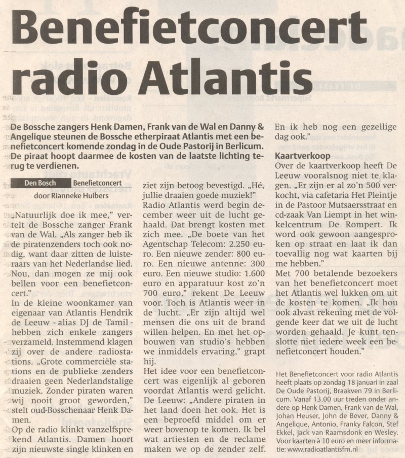 Den Bosch - 18 januari 2004 - De Bossche zangers Henk Damen, Frank van de Wal en Danny & Angelique steunen de Bossche etherpiraat Atlantis met een benefietconcert komende zondag in de oude Pastorij in Berlicum. De piraat hoopt daarmee de kosten van de laatste lichting terug te verdienen.
