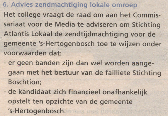 Den Bosch - 10 oktober 2004 - Het college vraagt de raad om aan het Commissariaat voor de Media te adviseren om Stichting Atlantis Lokaal de zendtijdmachtiging voor de gemeente 's-Hertogenbosch toe te wijzen onder voorwaarden dat: