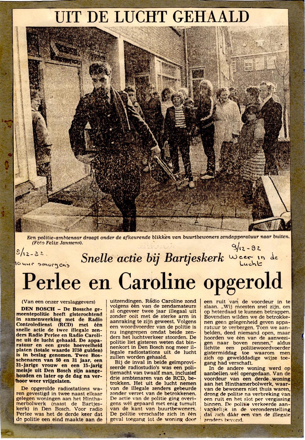 Den Bosch - 8 december 1982 - De Bossche gemeentepolitie heeft gisterochtend in samenwerking met de Radio Controledienst (RCD) met één snelle actie de twee illegale zenders Radio Perlee en Radio Caroline uit de lucht gehaald. De apparatuur en een grote hoeveelheid platen (totale waarde 3750 gulden) is in beslag genomen.