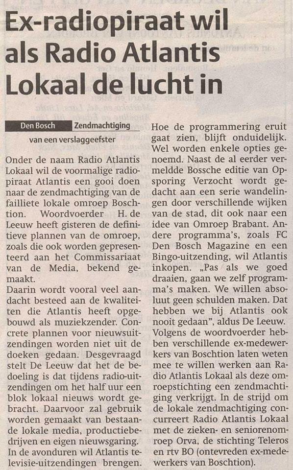 Den Bosch - 5 maart 2004 - Onder de naam Radio Atlantis Lokaal wil de voormalige radiopiraat Atlantis een gooi doen naar de zendmachtiging van de failliete lokale omroep Boschtion. Woordvoerder H. de Leeuw heeft gisteren de definitieve plannen van de omroep, zoals die ook worden gepresenteerd aan het Commissariaat van de Media, bekend gemaakt.
