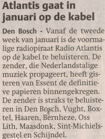 Den Bosch - 19 november 2005 - Vanaf de tweede week van januari is de voormalige radiopiraat Radio Atlantis op de kabel te beluisteren. De zender, die Nederlandstalige muziek propageert, heeft gisteren van Essent de definitieve papieren binnengekregen.
