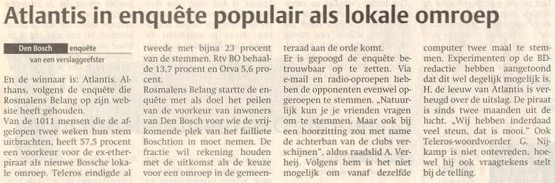 Den Bosch - 19 november 2004 - En de winnaar is: Atlantis. Althans, volgens de enquête die Rosmalens Belang op zijn website heeft gehouden. Van de 1011 mensen die de afgelopen twee weken hun stem uitbrachten, heeft 57,5 een voorkeur voor de ex-etherpiraat als nieuwe Bossche lokale omroep.