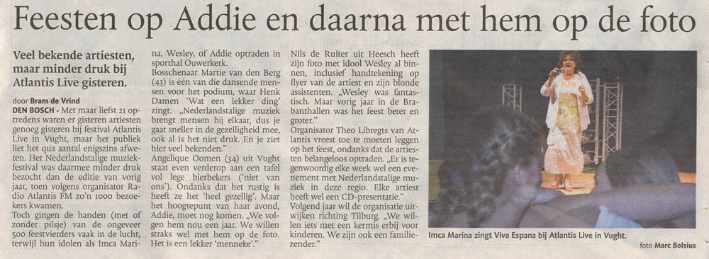 Den Bosch - 6 mei 2007 - Met maar liefst 21 optredens waren er gisteren artiesten genoeg bij festival Atlantis Live in Vught, maar het publiek liet het qua aantal enigszins afweten. Het Nederlandstalige muziekfestival was daarmee minder druk bezocht van vorig jaar.