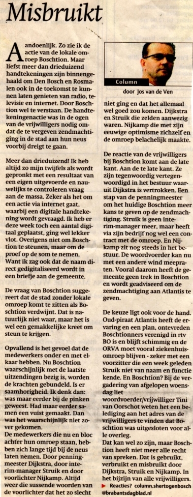 Den Bosch - 20 december 2003 - Aandoenlijk. Zo zie ik de actie van de lokale omroep Boschtion. Maar liefst meer dan drieduizend handtekeningen zijn binnengehaald om Den Bosch en Rosmalen ook in de toekomst te kunnen laten genieten van radio, televisie en internet.