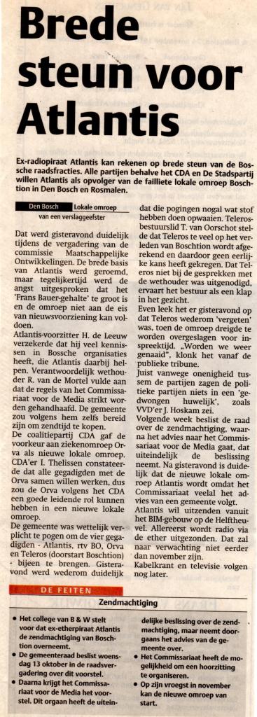 Den Bosch - 20 december 2004 - Ex-radiopiraat Atlantis kan rekenen op brede steun van de Bossche raadsfracties. Alle partijen behalve het CDA en De Stadspartij willen Atlantis als opvolger van de failliete lokale omroep Boschtion in Den Bosch en Rosmalen.