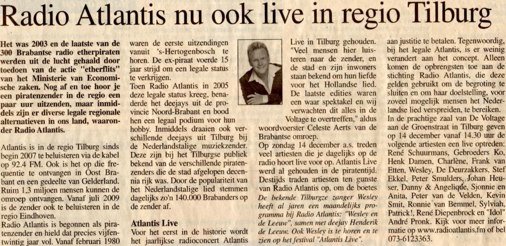 Den Bosch - 17 januari 2008 - Het was 2003 en de laatste van de 300 Brabantse radio etherpiraten werden uit de lucht gehaald door toedoen van de actie "etherflits"van het ministerie van Economische zaken. Nog af en toe hoor je een piratenzender in de regio een paar uur uitzenden, maar inmiddels zijn er diverse legale regionale alternatieven in ons land, waaronder Radio Atlantis.