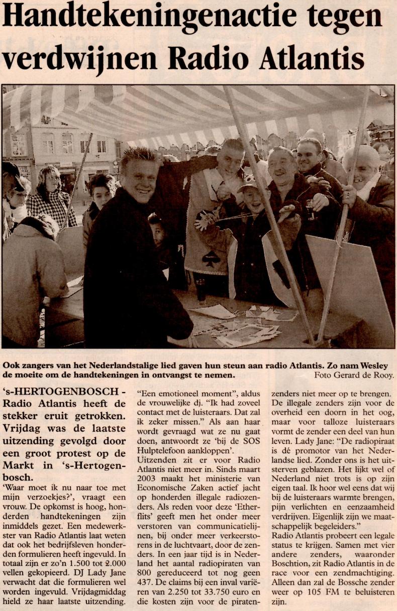 Den Bosch - 20 februari 2004 - Radio Atlantis heeft de stekker eruit getrokken. Vrijdag was de laatste uitzending gevolgd door een groot protest op de markt in 's-Hertogenbosch. Waar moet ik nu naar toe met mijn verzoekjes?