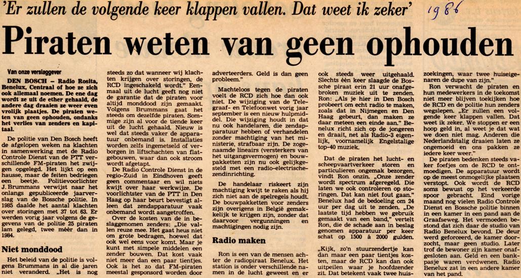 Den Bosch - 28 maart 1986 - Radio Rosita, Benelux, Centraal of hoe ze zich ook allemaal noemen. De ene dag wordt ze uit de ether gehaald, de andere dag draaien ze weer even vrolijke plaatjes. De piraten weten van geen ophouden, ondanks het verlies van zenders en kapitaal.
