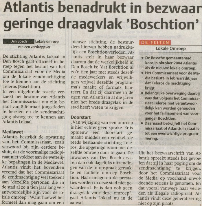 Den Bosch - 4 april 2005 - De stichting Atlantis Lokaal in Den Bosch gaat officieel in beroep tegen het besluit van het Commissariaat voor de Media om de lokale zendmachtiging toe te kennen aan de stichting Teleros (Boschtion)