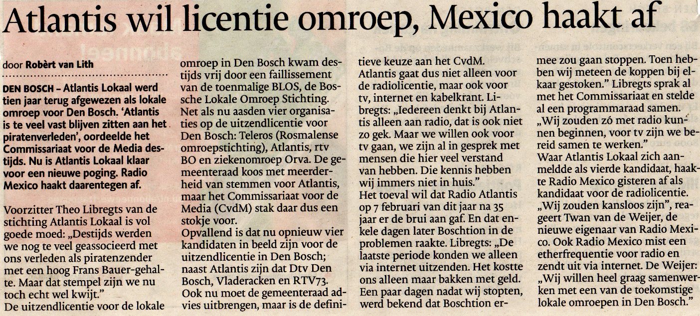 Den Bosch - 24 februari 2015 - Atlantis Lokaal werd tien jaar terug afgewezen als lokale omroep voor Den Bosch. 'Atlantis is te veel vast blijven zitten aan het piratenverleden', oordeelde het Commissariaat voor de Media destijds. Nu is Atlantis Lokaal klaar voor een nieuwe poging. Radio Mexico haakt daarentegen af.