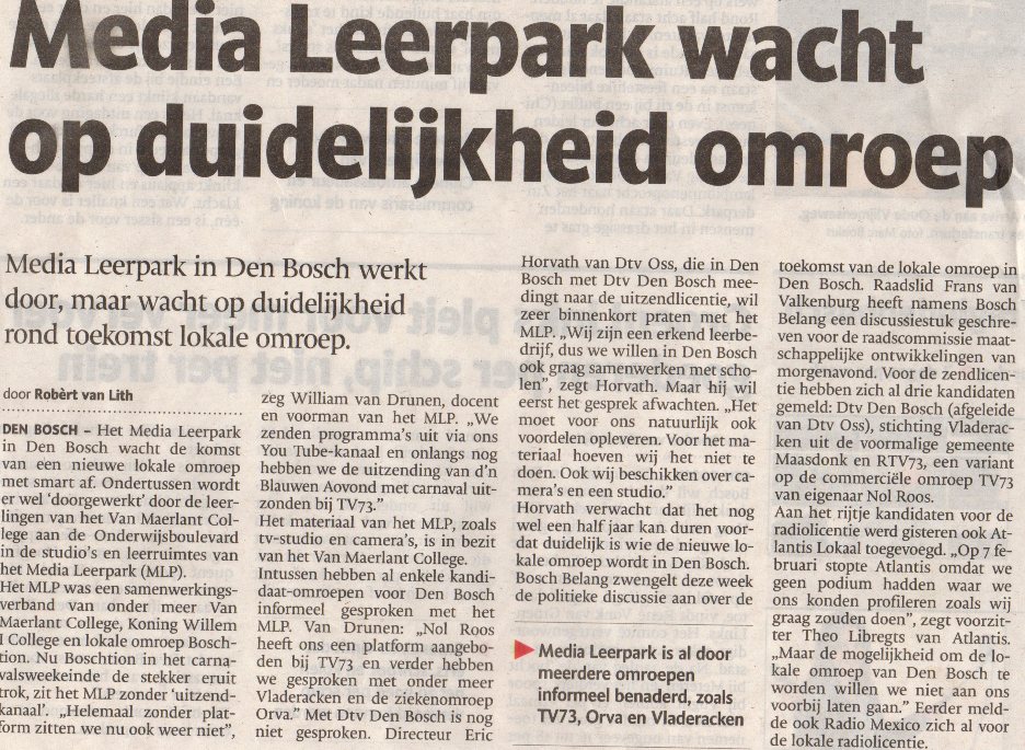 Den Bosch - 24 februari 2015 - Het media Leerpark in Den Bosch wacht de komst van een nieuwe lokale omroep met smart af. Ondertussen wordt er wel 'doorgewerkt' door de leerlingen van het Van Maerlant College aan de Onderwijsboulevard in de studio's en leerruimtes van het Media Leerpark (MLP)