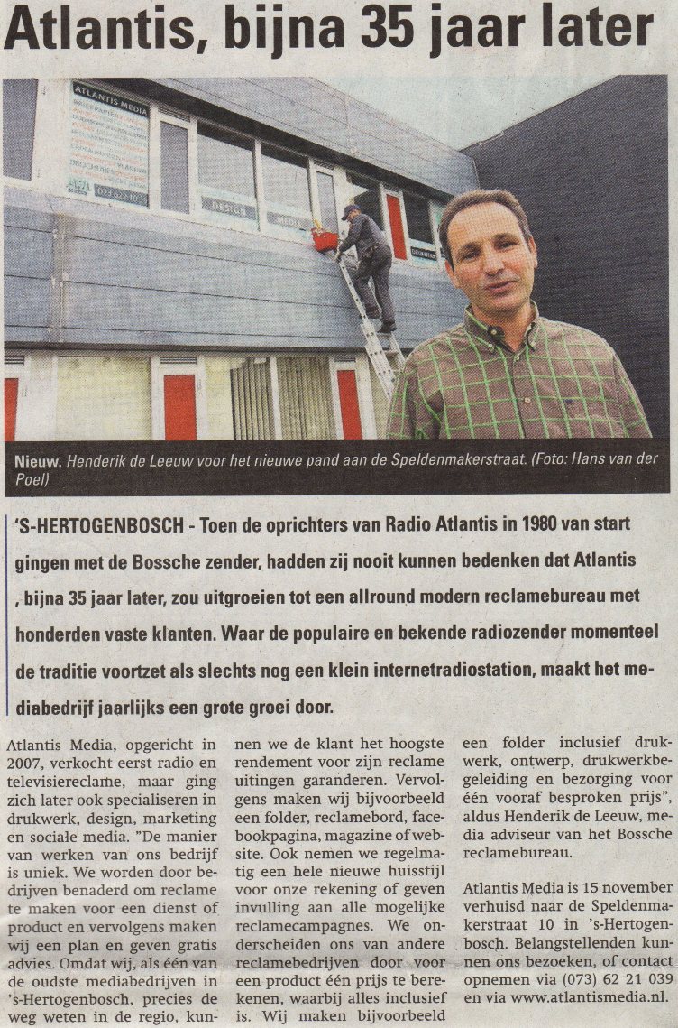 Den Bosch - 24 maart 2015 - Toen de oprichters van Radio Atlantis in 1980 van start gingen met de Bossche zender, hadden zij nooit kunnen bedenken dat Atlantis, bijna 35 jaar later, zou uitgroeien tot een allround modern reclamebureau met honderden vaste klanten. Waar de populaire en bekende radiozender momenteel de traditie voortzet als slechts nog een klein internetradiostation, maakt het mediabedrijf jaarlijks een grote groei door.