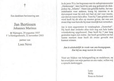Den Bosch - 22 november 2003 - Jan Bertissen stond bekend als "DJ de Rat" en had een eigen radiopiratenzender genaamd "Heideroosje". Ook was Jan jaren lang DJ bij Radio Atlantis. Van de begintijd van Atlantis tot in het jaar 1993 draaide hij nog steeds zijn plaatjes voor de mensen. Zijn schoonzoon Ronald bouwde het legale Radio Atlantis in 2005 nog mee op.