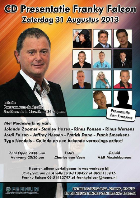 Op zaterdag 31 augustus is het gezellig uitgaan in Vlijmen bij de Cd Presentatie van de Bossche zanger Franky Falcon. Met medewerking van veel Nederlandstalige artiesten zoals Jolanda Zoomer, Stanley Hazes, Rinus Ponsen en Jordi Falcon wordt dit een avond om niet te vergeten.