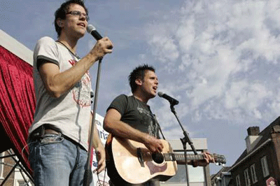 Nick en Simon tijdens hun optreden op het podium op de Markt. Foto's Gérard Damoiseaux